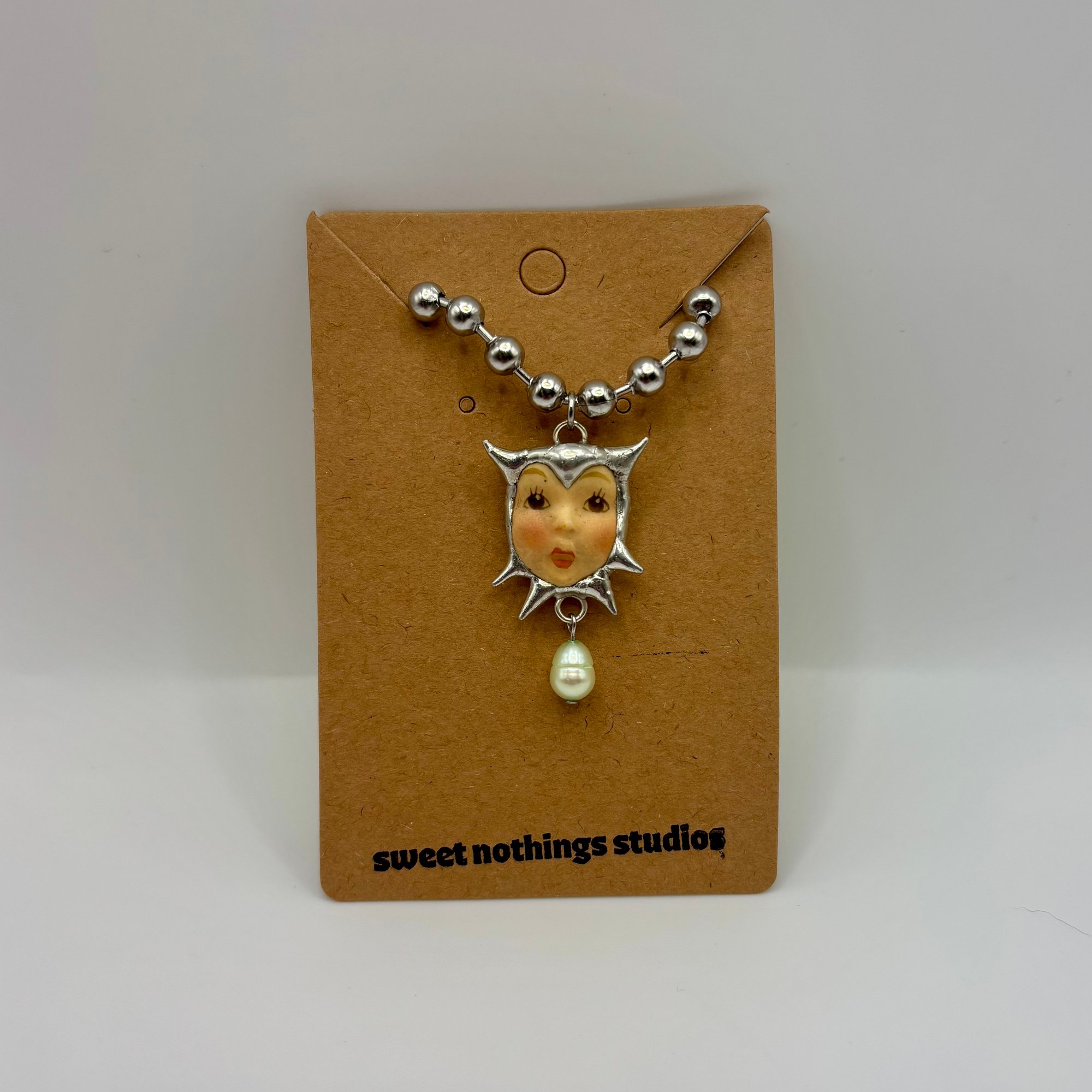 Adorable soft soldered pendant made with vintage thrifted trinkets and a cultured pearl. Includes a 16 inch stainless steel ball chain.