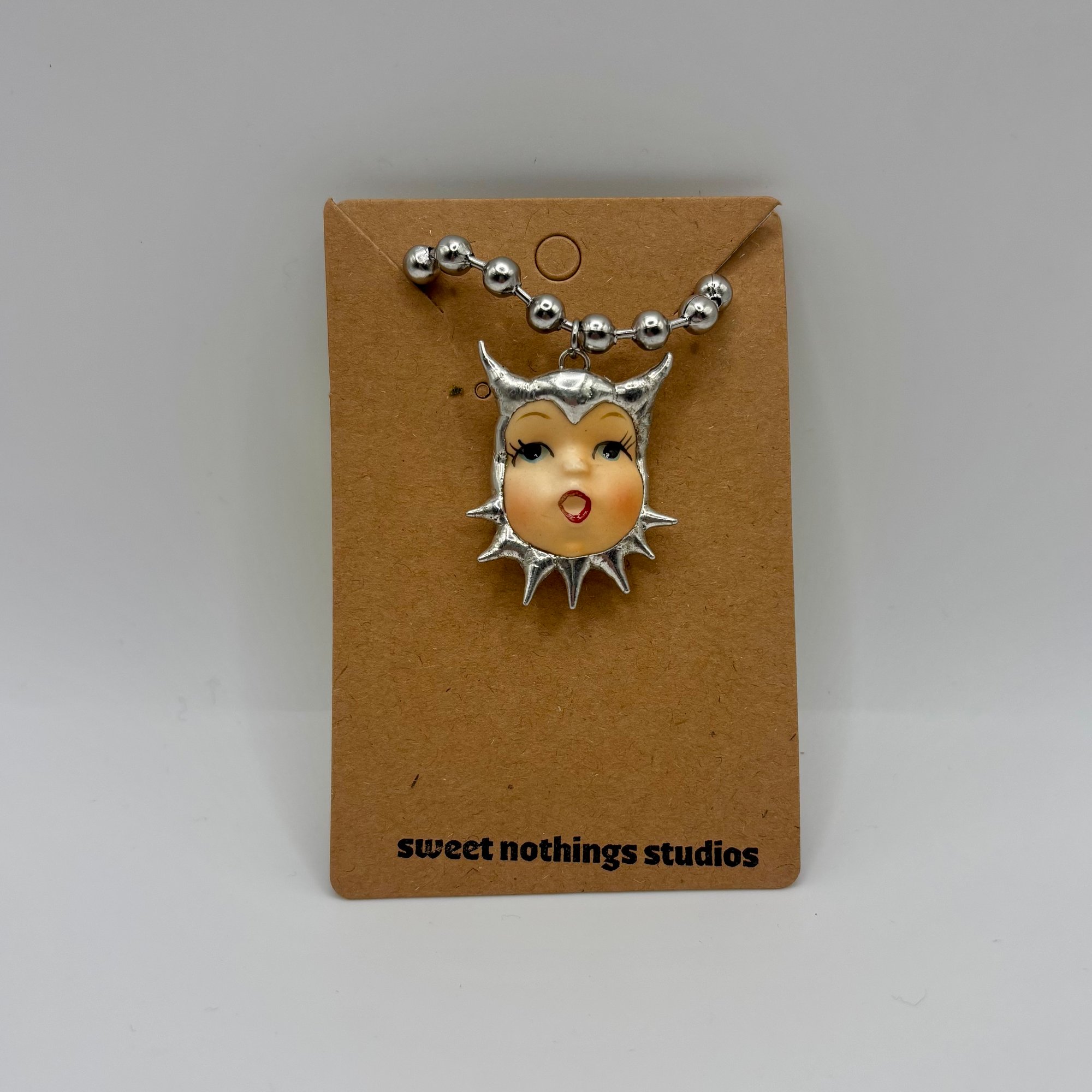 Adorable soft soldered pendant made with vintage thrifted trinkets. Includes an adjustable 16 inch stainless steel ball chain.