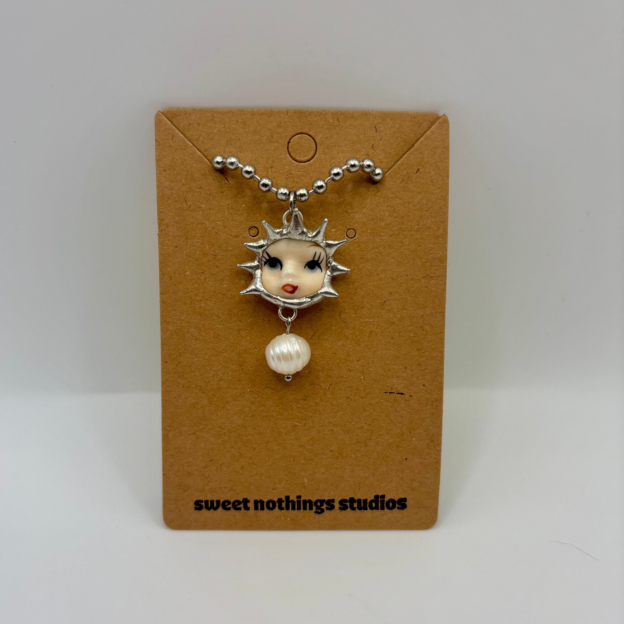 Adorable soft soldered pendant made with vintage thrifted trinkets and a cultured pearl. Includes a 16 inch stainless steel ball chain.