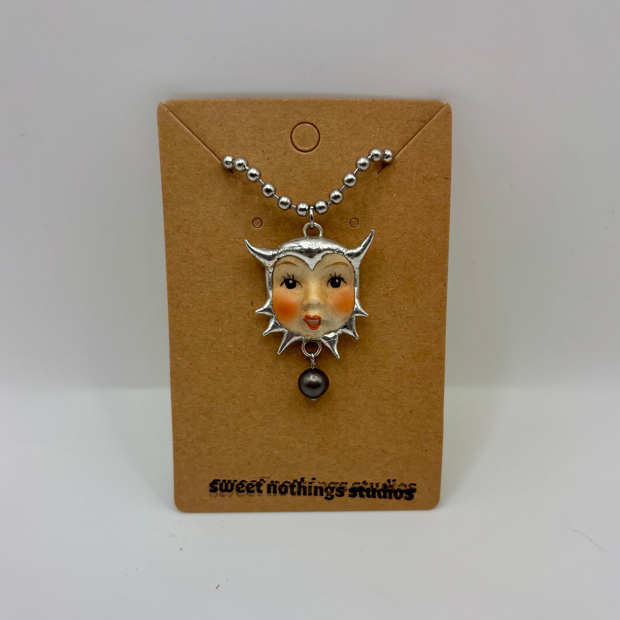 Adorable soft soldered pendant made with vintage thrifted trinkets and a cultured pearl. Includes a 16 inch stainless steel ball chain.