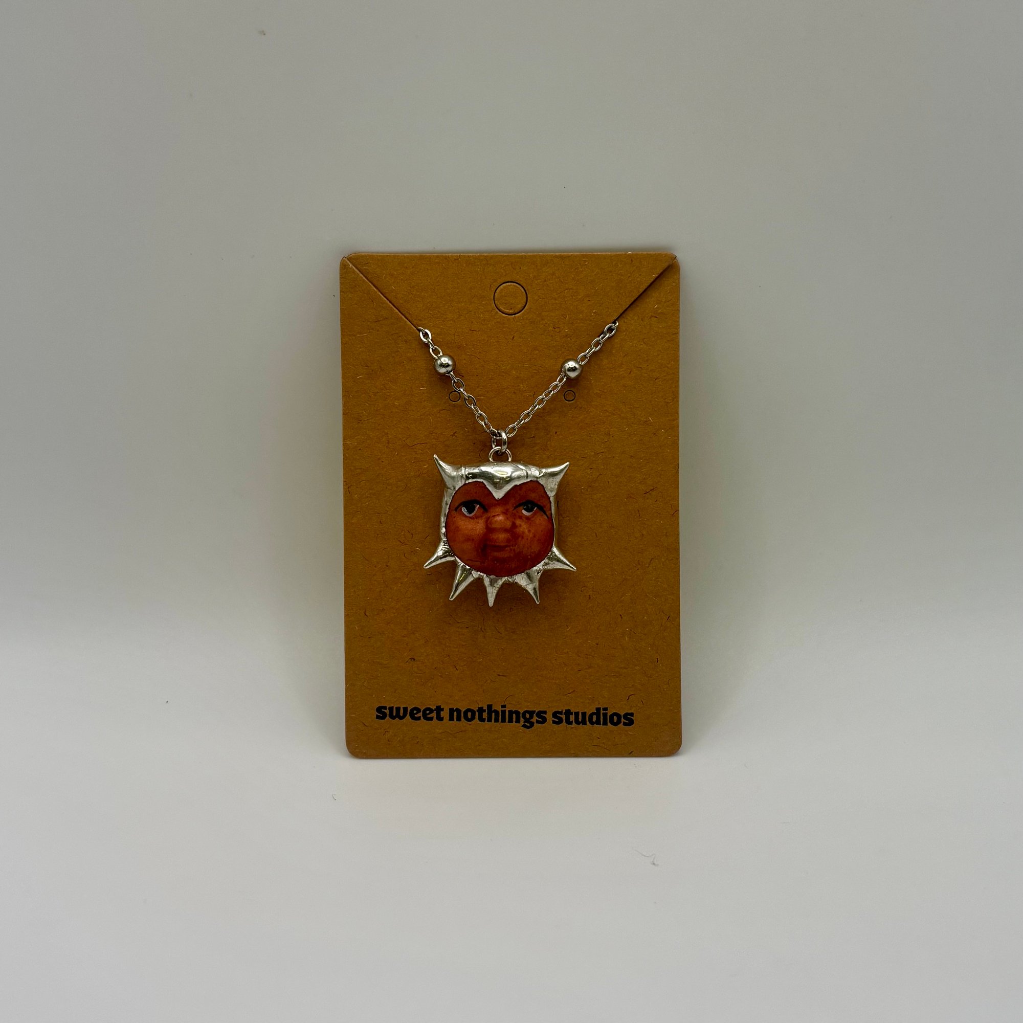 Adorable soft soldered pendant made with vintage thrifted trinkets. Includes an adjustable 16-18 inch stainless steel chain.