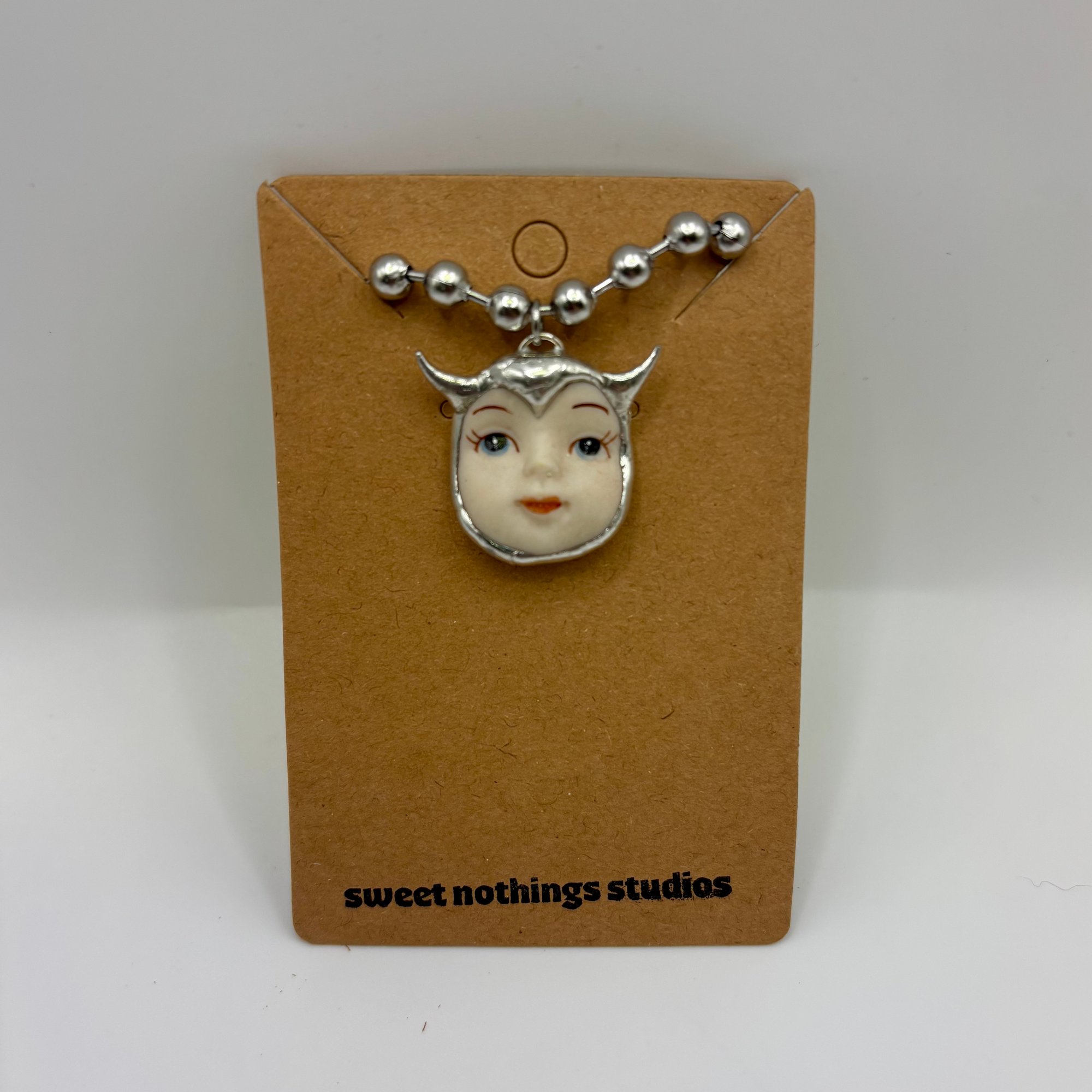 Adorable soft soldered pendant made with vintage thrifted trinkets. Includes a 16 inch stainless steel ball chain.