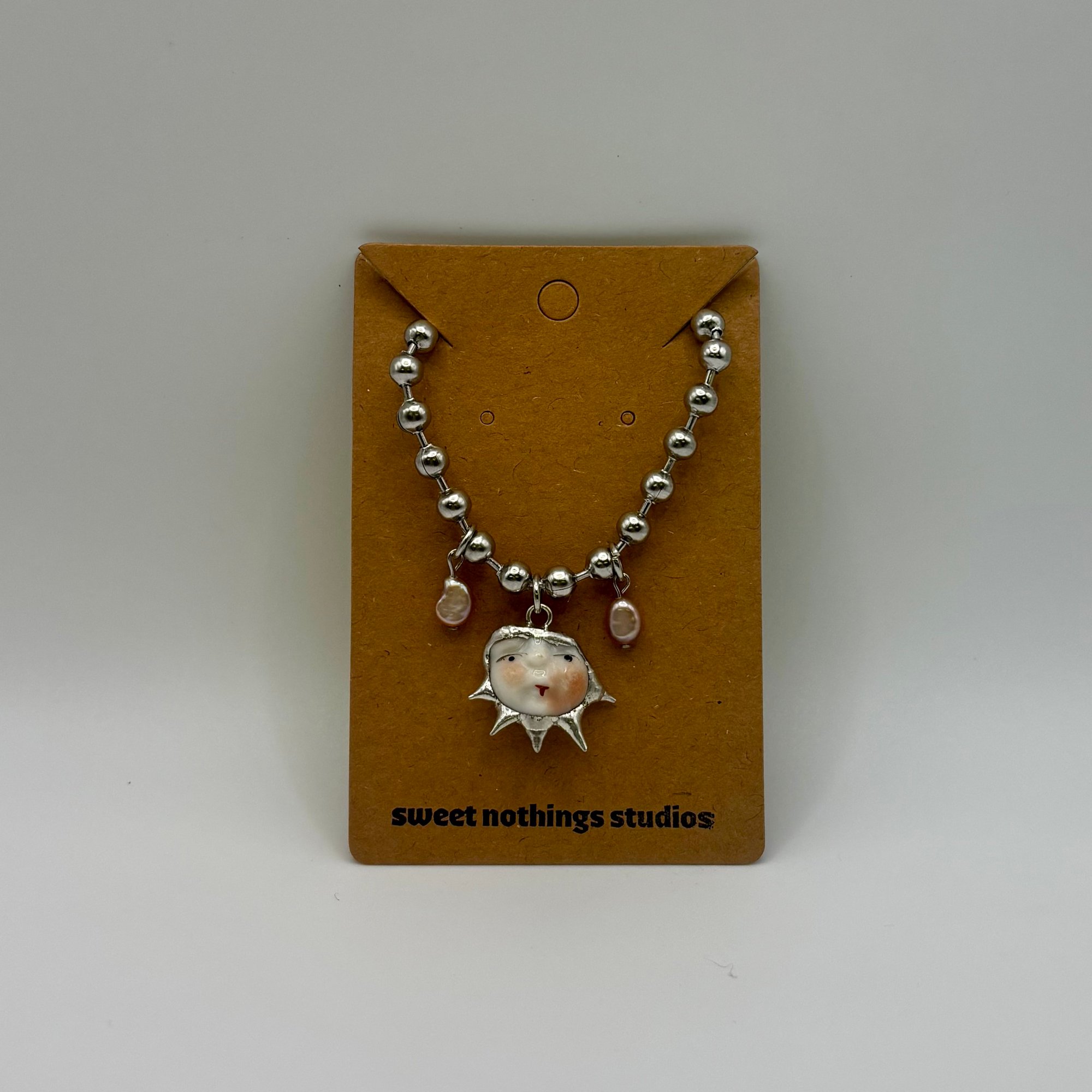 Adorable soft soldered pendant made with vintage thrifted trinkets and cultured pearls. Includes a 16 inch stainless steel ball chain.