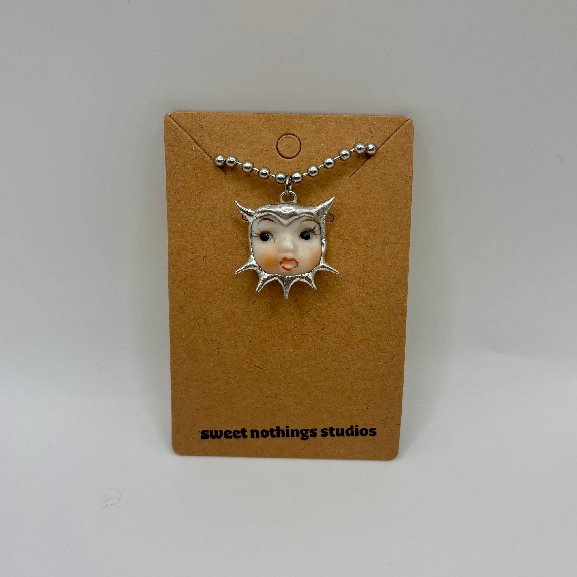 Adorable soft soldered pendant made with vintage thrifted trinkets. Includes a 16 inch stainless steel ball chain.