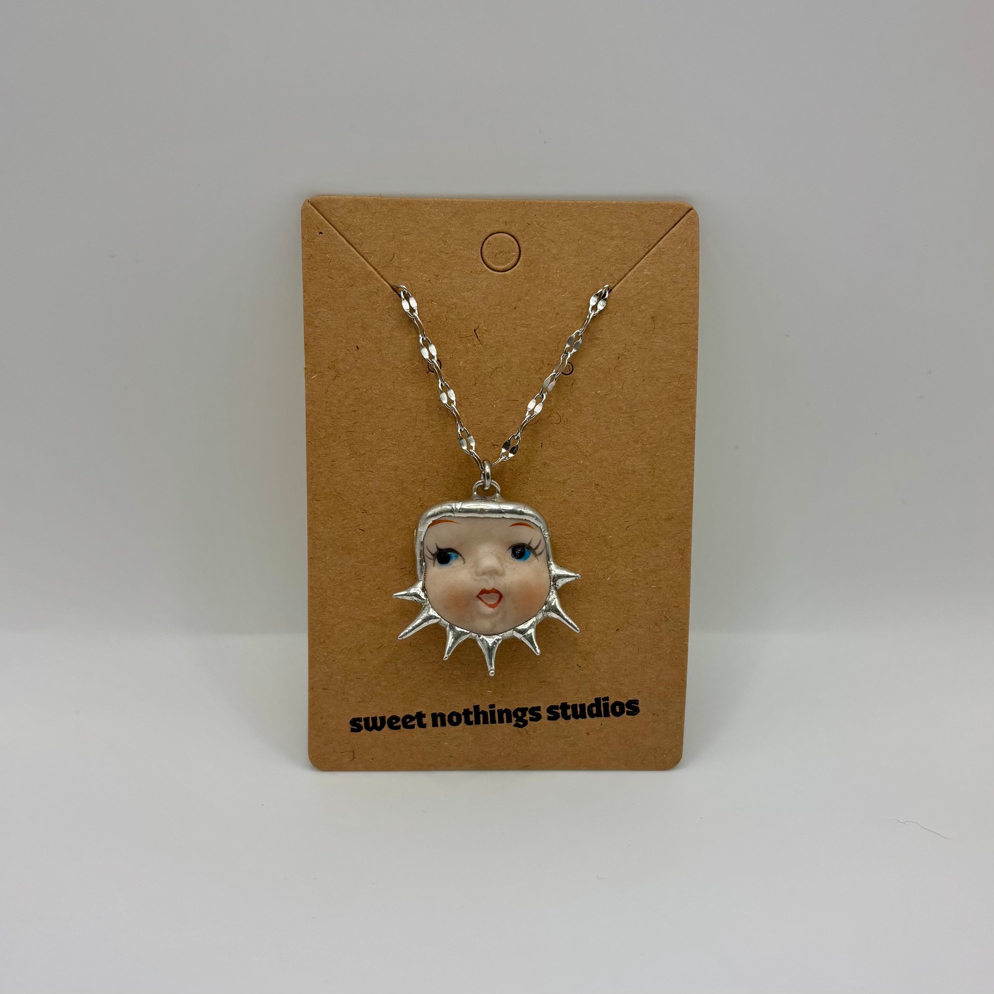 Adorable soft soldered pendant made with vintage thrifted trinkets. Includes an adjustable 16-18 inch stainless steel chain.