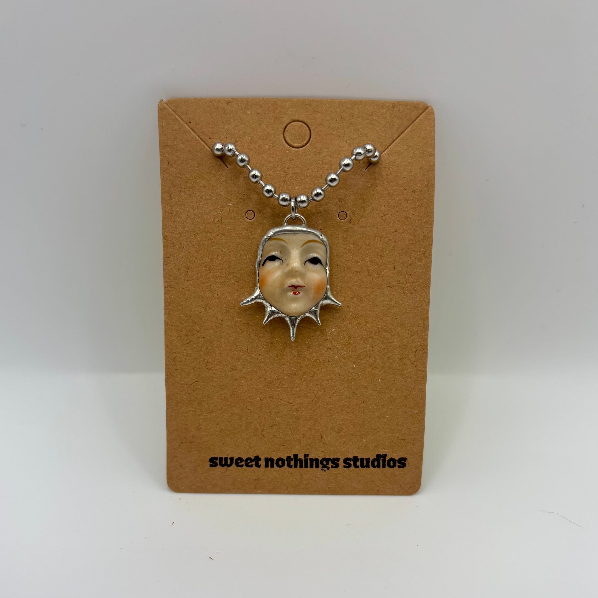 Adorable soft soldered pendant made with vintage thrifted trinkets. Includes a 16 inch stainless steel ball chain.