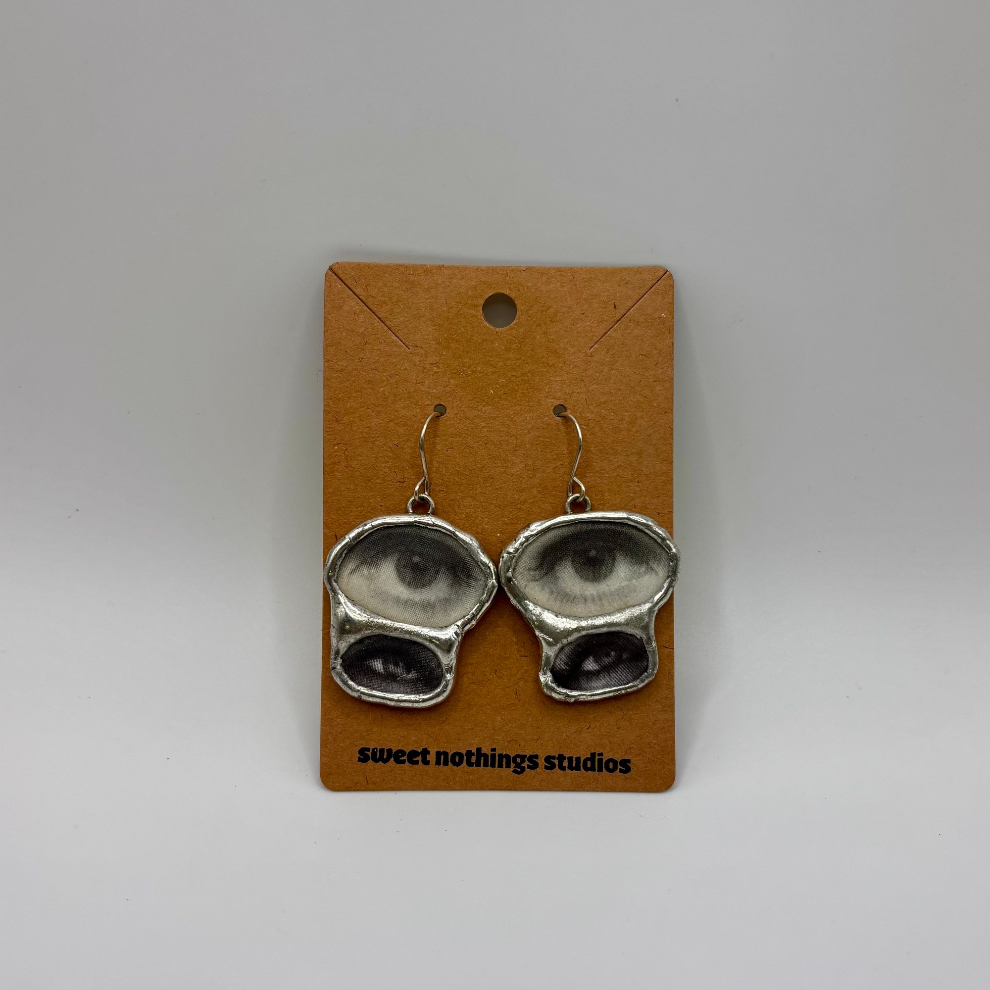 Freaky little eyeball dangles made from vintage magazine clippings. Each earring weighs approx. .25 oz.