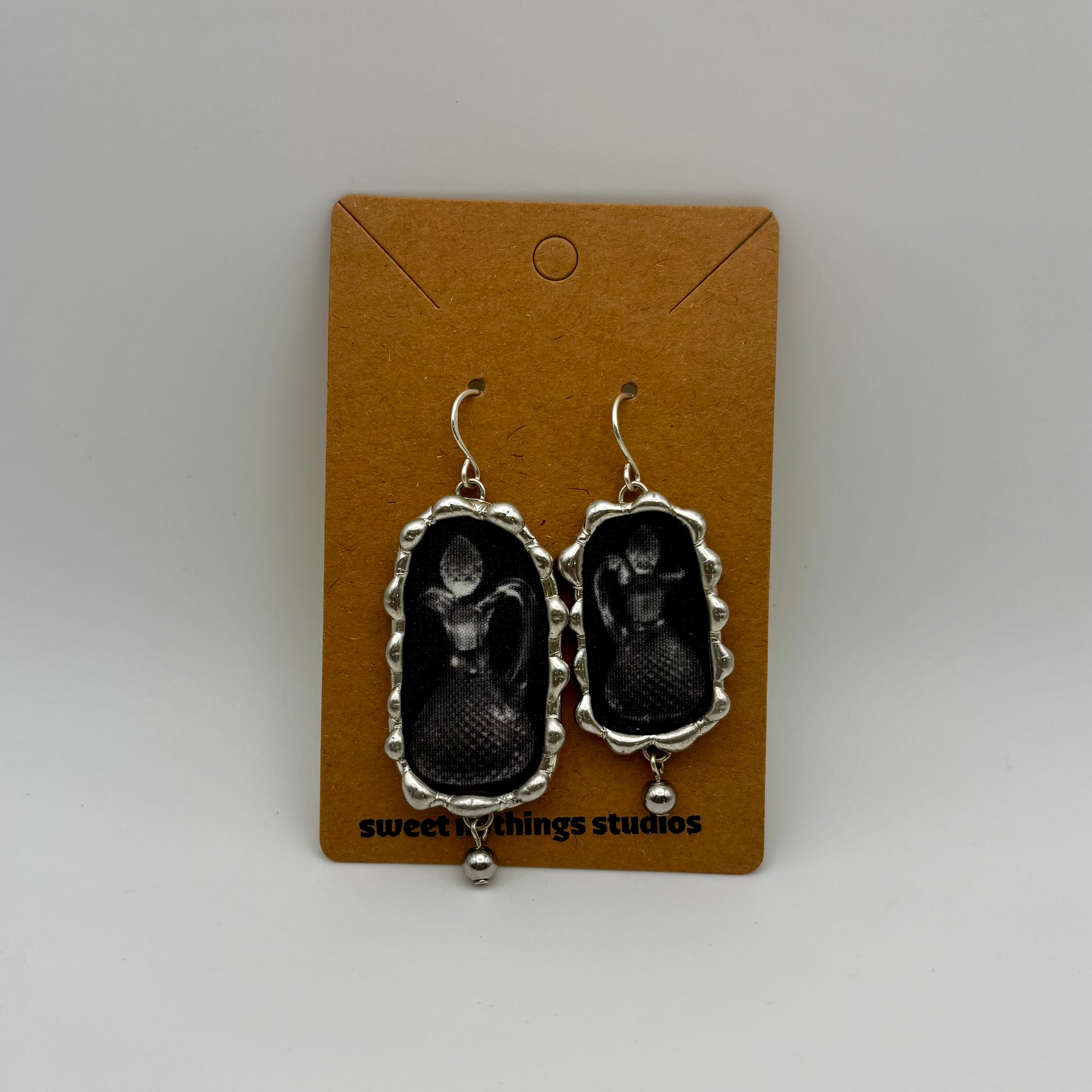 Adorable soft soldered earrings made with vintage magazine/book clippings and stainless steel beads. Each earring weighs approximately .26oz each.