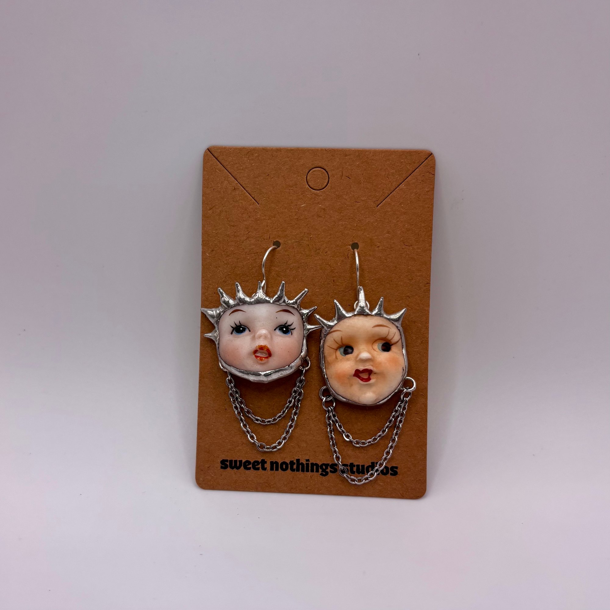 All earring hooks are sterling silver unless otherwise stated. Lead free solder is made up of a silver/copper/tin alloy. All findings and chains are stainless steel. Due to the handmade nature of this piece, handle with care. Spikes are...spiky. Glass and ceramic elements are fragile, always wear earring backs. DO NOT GET JEWELRY WET. See FAQ page for jewelry care.