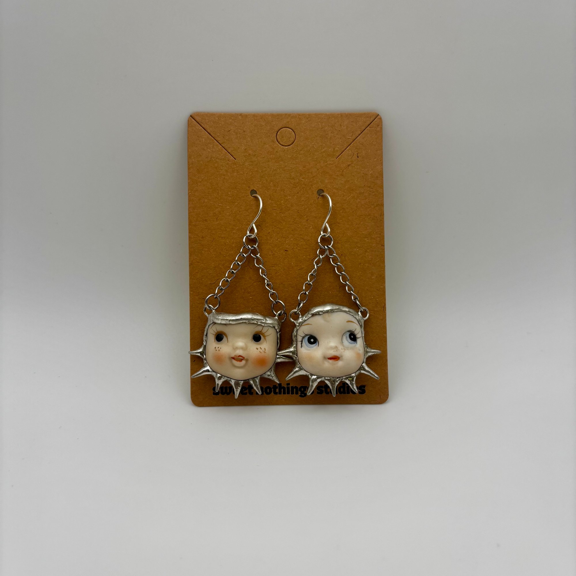 All earring hooks are sterling silver unless otherwise stated. Lead free solder is made up of a silver/copper/tin alloy. All findings and chains are stainless steel. Due to the handmade nature of this piece, handle with care. Spikes are...spiky. Glass and ceramic elements are fragile, always wear earring backs. DO NOT GET JEWELRY WET. See FAQ page for jewelry care.