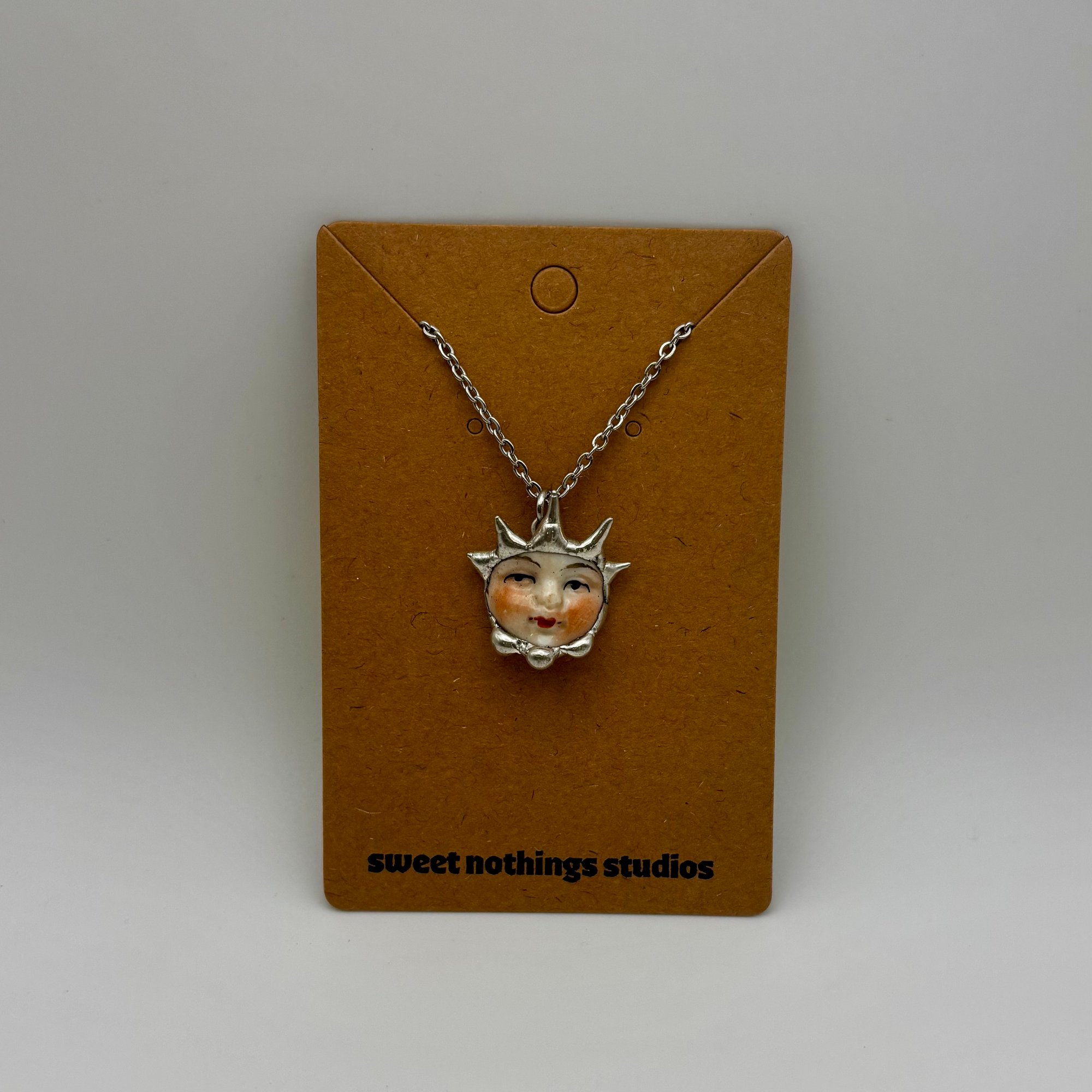 Adorable soft soldered pendant made with vintage thrifted trinkets. Includes an adjustable 16-18 inch stainless steel chain.