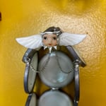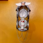 Trinket shelf made out of old canning jar lids reclaimed from the woods and thrifted trinkets. Perfect for trinkets, votive candles, or small photos.