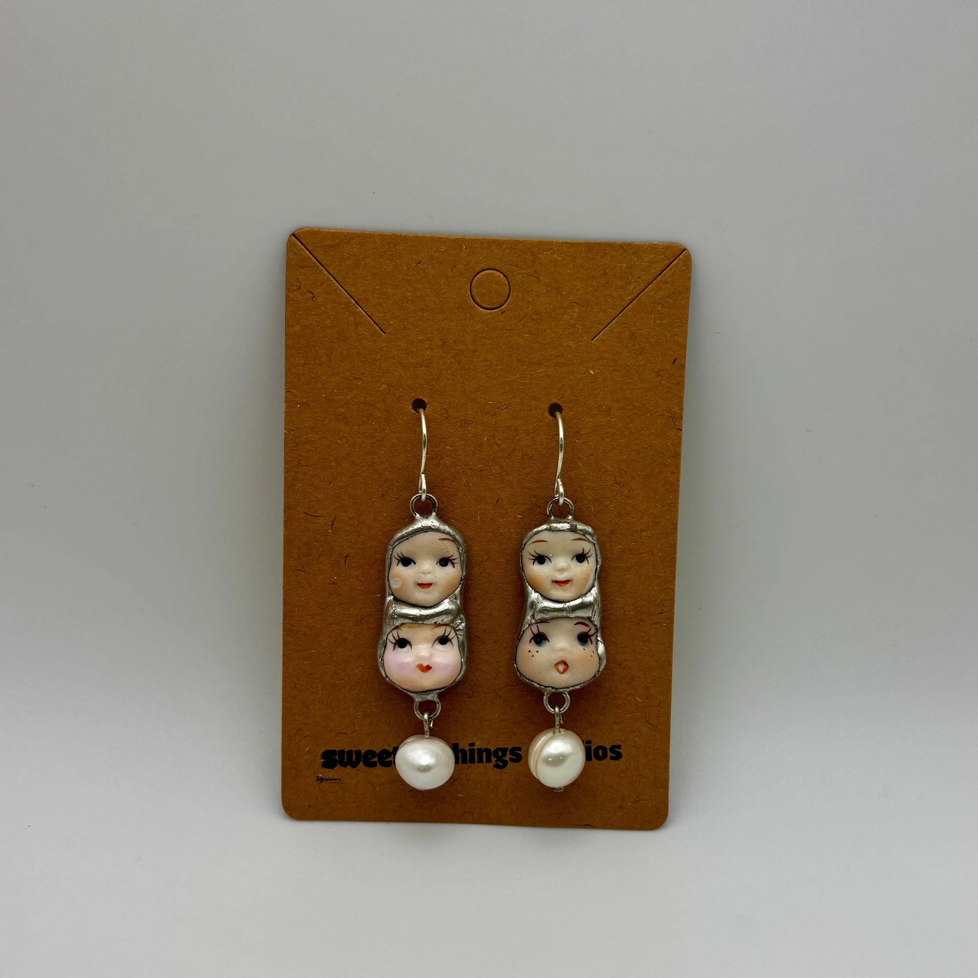 Adorable soft soldered earrings made with vintage thrifted trinkets and cultured pearls. Each earring weighs approx. .21oz each.
